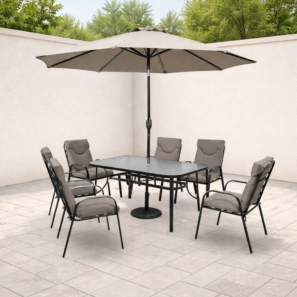 - طقم متكامل: طاولة + 6 كراسي + مظلة