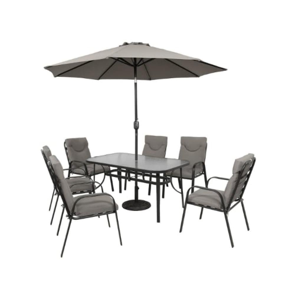يتكون الطقم من طاولة أنيقة مع 6 كراسي مريحة ومظلة كبيرة توفر ظلا مثاليا، مما يجعله الخيار الأمثل للجلسات العائلية، العزائم، والاسترخاء في الهواء الطلق.